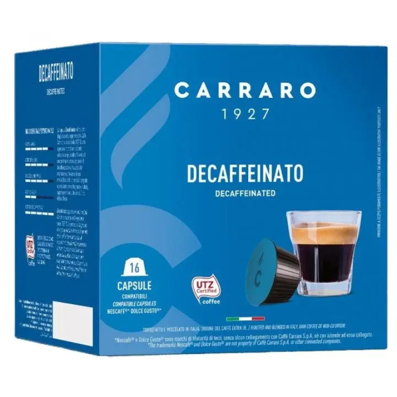 Капсулы Carraro 1927 Decaffeinato, совместимые с кофемашинами Dolce Gusto®, создаются на основе многолетнего опыта бренда Caffè Carraro, существующего с 1927 года. Этот кофе разработан для тех, кто ищет насыщенный вкус и мягкость без содержания кофеина. Каждая капсула содержит тщательно отобранные кофейные зёрна, которые проходят уникальный процесс декофеинизации, сохраняя естественные качества напитка.